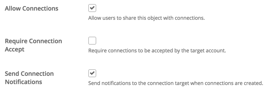 Connections allow for users of your applications to easily share data. They can be created by a user and can extend access to objects from that user to another.