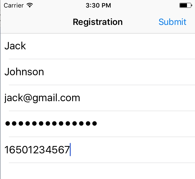 submitPressedfunction before calling register.let phoneUtil = NBPhoneNumberUtil() do { let myNumber = try phoneUtil.parse(mobileNumberField.text!, defaultRegion: "US") if !phoneUtil.isValidNumber(myNumber) { return } } catch let error as NSError { print(error) }