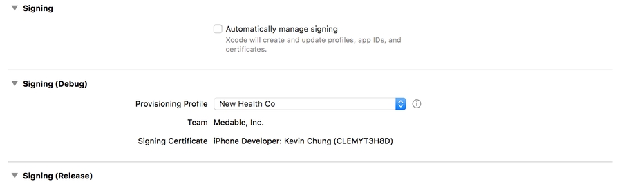 Now navigate to your Project Settings and uncheck the Automatically manage signing option. We'll upload a provisioning profile specific to this app instead. We didn't cover how to get a provisioning profile from the apple dev center but you can find instructions on how to do this from other online resources.