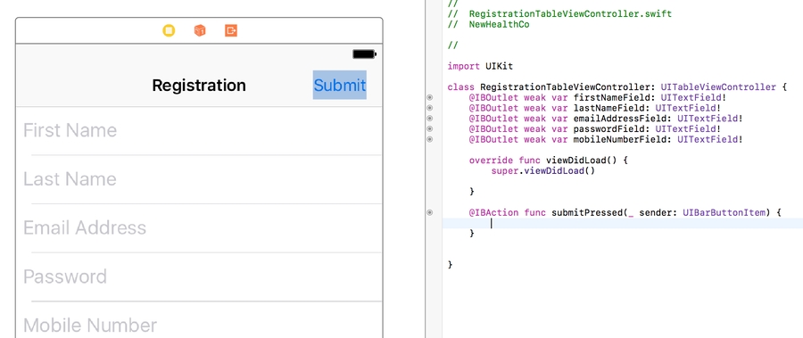 Associate an IBAction called "submitPressed" with the "Submit" button